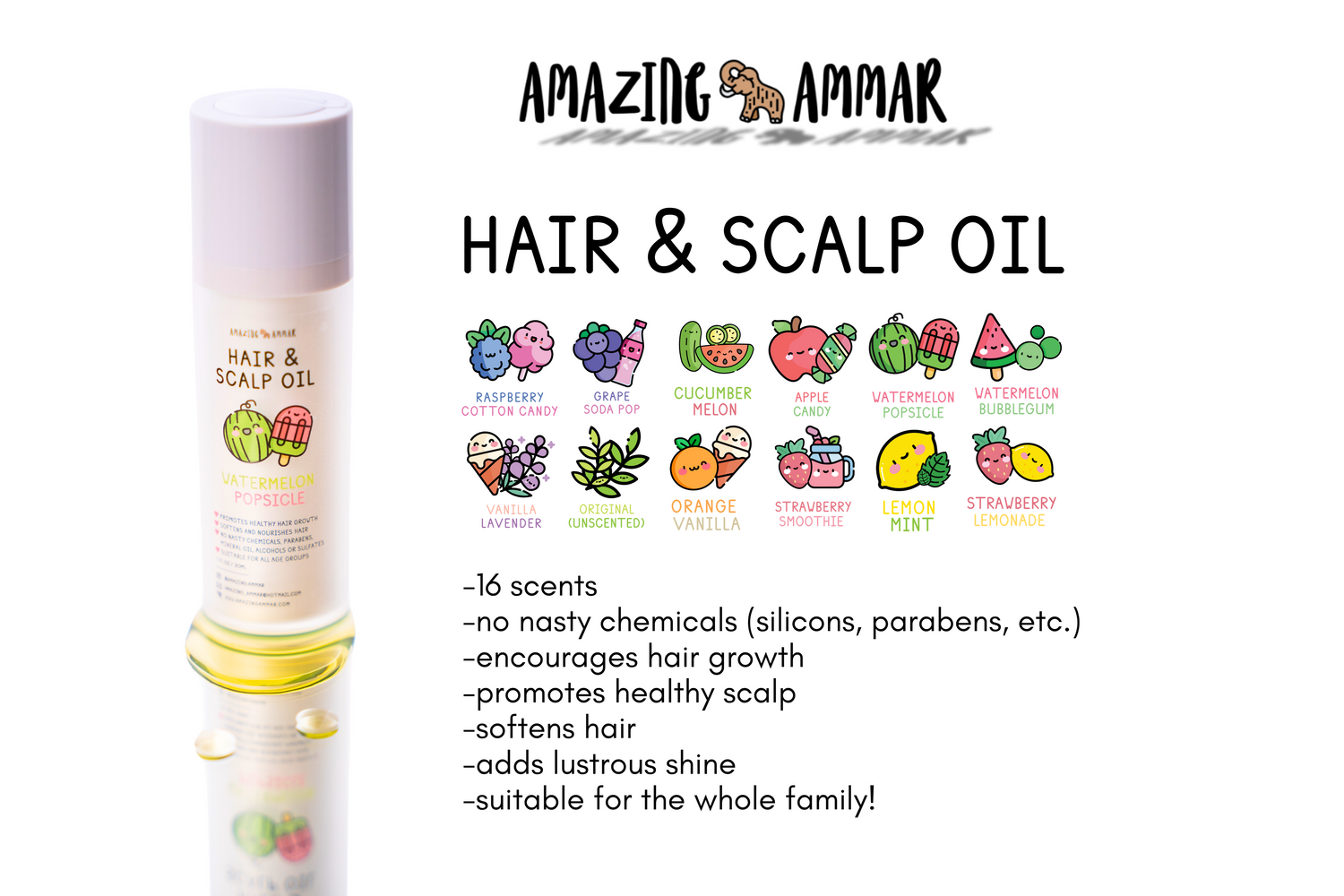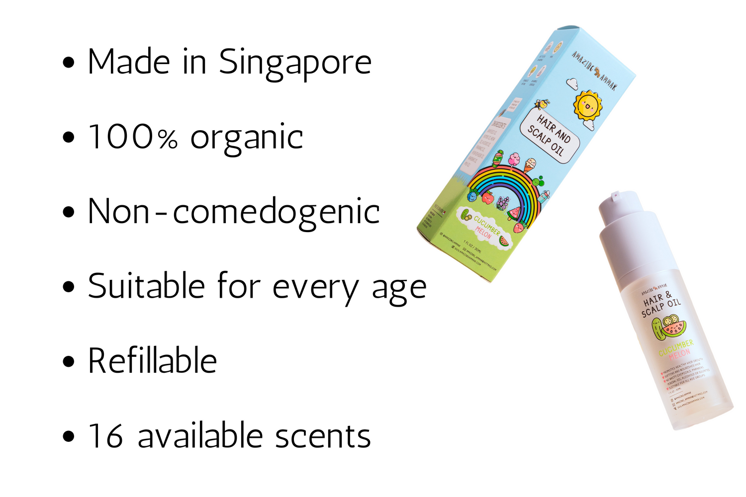 Hi there! We are a local company proudly based in Singapore and we manufacture hair oil that is undiluted, potent, contains no harmful chemicals and is suitable for all age groups. Available in 16 amazing scents. Grab a bottle for yourself, your baby or gift it to your family and friends!